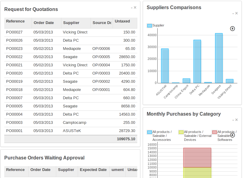 在恰当的时候建立采购需求从而减少库存的积压。根据库存水平,物流规则,销售订单,预测的制造订单而定制的采购原则提升采购和库存的效率。 只需一键就可以发送报价和采购订单的需求。从采购模块中可以操作产品接收和票据。